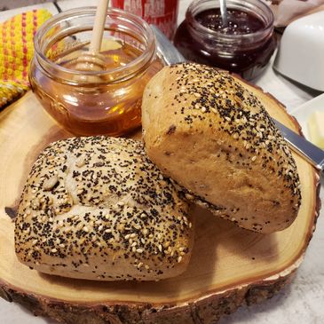 Multi grain bread roll sprinkled with poppy seeds, sesame and sunflower seeds.